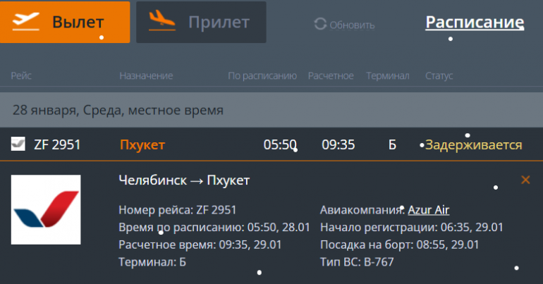 Согласно расписанию, самолёт должен был отправиться из Челябинска 28 января в 05.50. Теперь новым временем вылета значится 09.35 следующего дня. Таким образом, задержка составит около 28 часов.