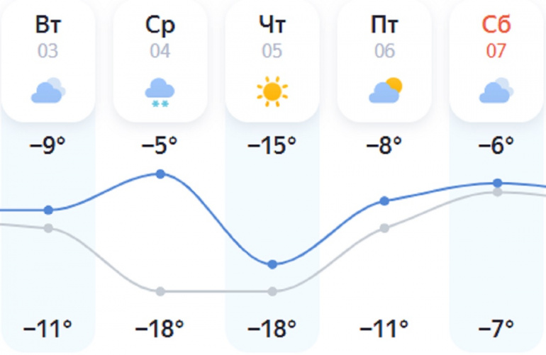Предстоящая неделя в Челябинске, по данным «Яндекс.Погоды», будет относительно тёплой. Только две ночи будет подмораживать до -18, а возвращения 30-градусных морозов пока можно не опасаться.