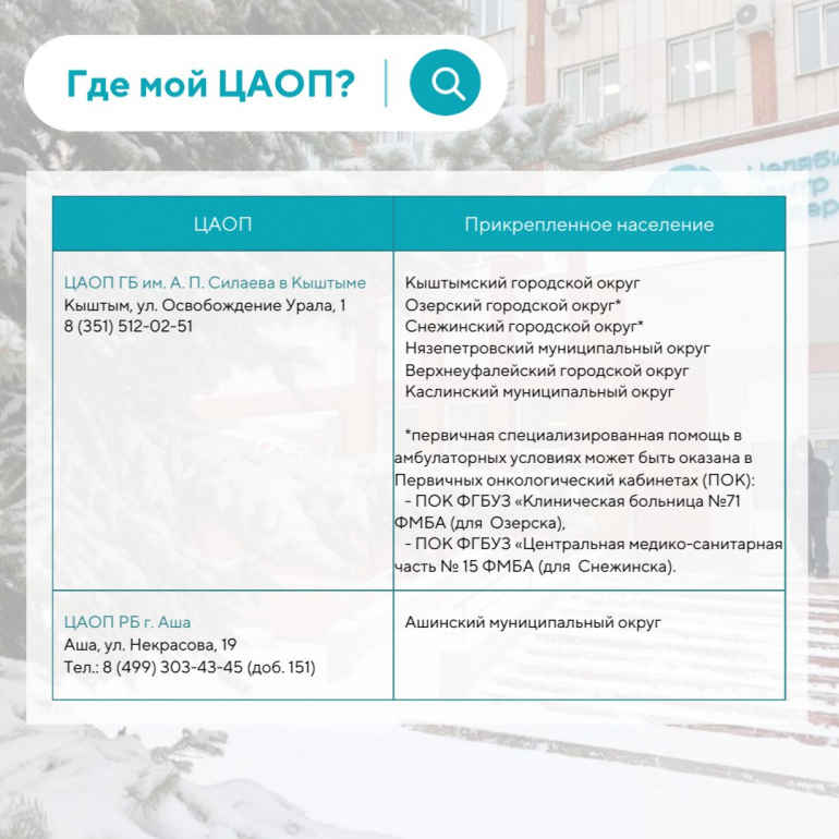 Жителям Челябинской области стало проще и быстрее пройти обследование и получить направление на лечение онкологических заболеваний. Для этого в регионе создана сеть из 16 центров амбулаторной онкологической помощи — ЦАОП. Они помогают сократить путь пациента от первых симптомов до начала лечения. Рассказываем, куда обращаться.