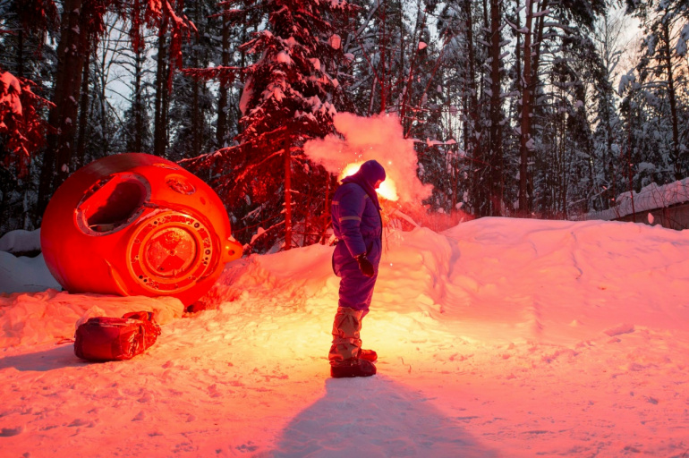 По сценарию спускаемый аппарат с экипажем совершил аварийную посадку зимой в лесу. Космонавтам нужно дождаться спасателей.