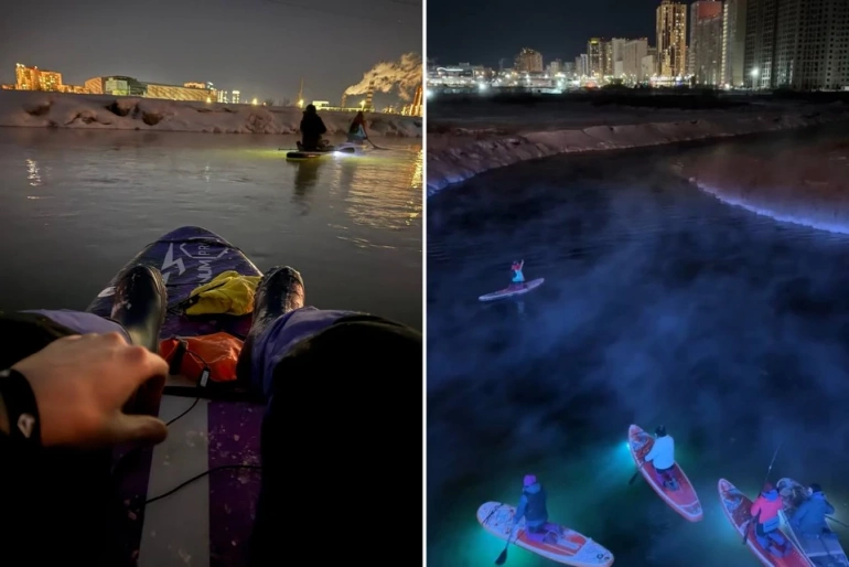 В Челябинске компания любителей активного отдыха отправилась в необычное путешествие в 20-градусный мороз. Парни и девушки проплыли на сапах по зимней реке Миасс под светом фонарей и в клубах тумана.
