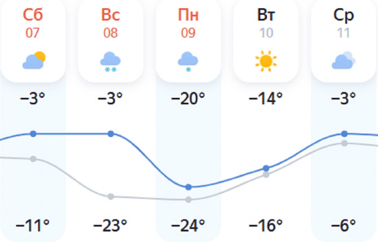 Снегопады продолжатся ещё минимум двое суток, в том числе и в Челябинске. По ночам будет подмораживать до -23, но на юге и крайнем западе будет значительно теплее. Днём -3…-9, в Челябинске -3…-5, на юге — до +1. По данным «Яндекс.Погоды», в ночь на понедельник в региональном центре ударят 24-градусные морозы.