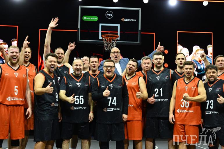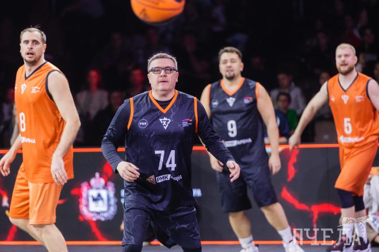 Встреча команд Евгения Иванова и Виталия Носова завершилась победой первой, в которой играл губернатор. К слову, глава региона не раз метко отправил мяч в корзину.