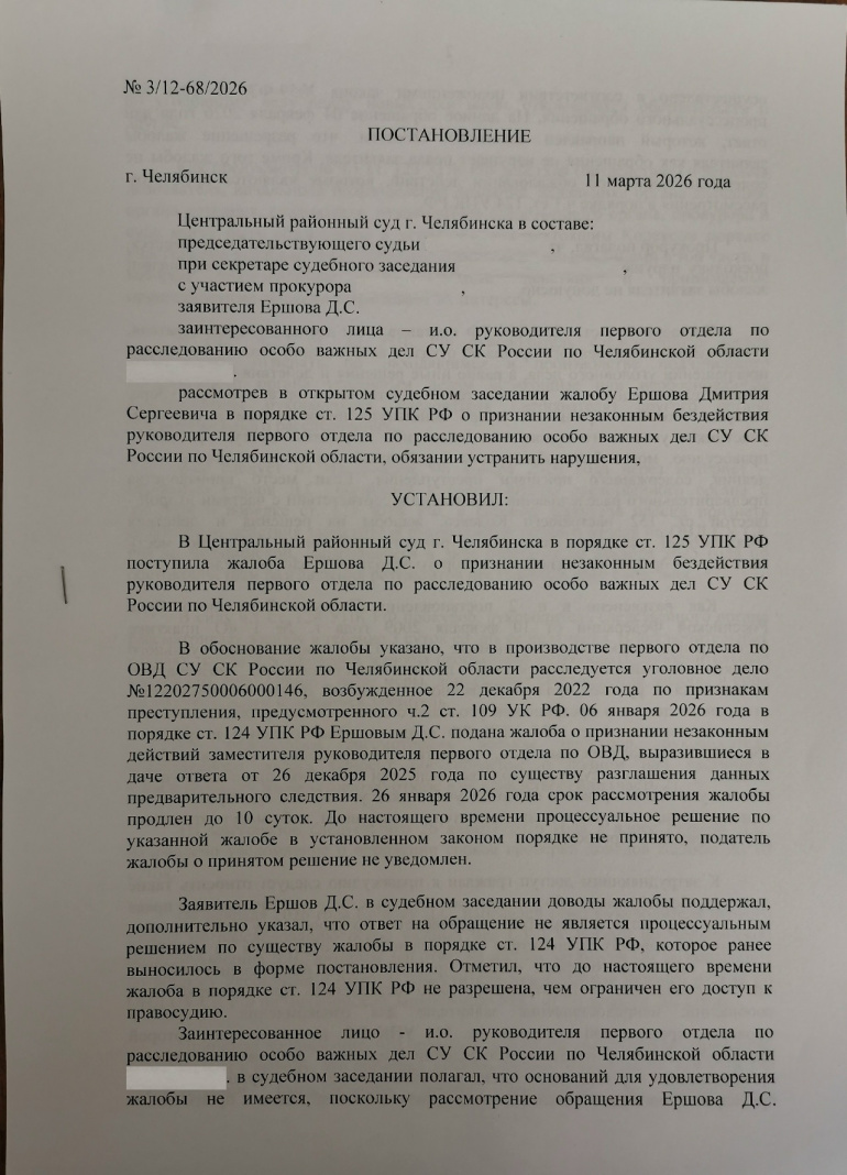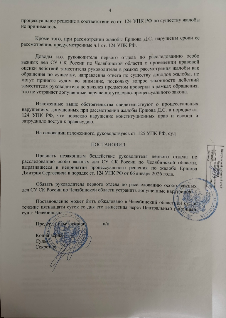 Центральный районный суд Челябинска, руководствуясь статьёй 125 УПК РФ, постановил «признать незаконным бездействие руководителя первого отдела по расследованию особо важных дел СУ СК России по Челябинской области, выразившееся в непринятии процессуального решения по жалобе Ершова Дмитрия Сергеевича, поданной в порядке статьи 124 УПК РФ 06 января 2026 года». Также постановление обязывает «руководителя первого отдела устранить допущенные нарушения и принять предусмотренное законом процессуальное решение».
