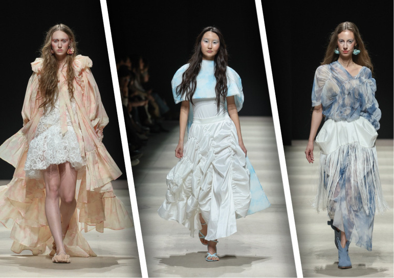 В своей новой весенней коллекции дизайнер Татьяна Котова представила образы, состоящие из оттенков неба — от утренней дымки до розового заката. Отметим, что ленты, принты и пелерины отсылают к ретро-футуризму, во времена первых покорителей воздушного пространства на шарах.