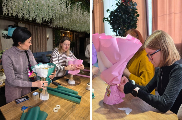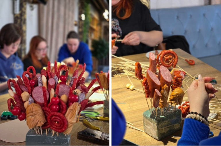 Серию необычных мастер-классов в Челябинске Вера провела в преддверии весенних праздников. Участницы создавали яркие и аппетитные композиции из мясных деликатесов к 23 февраля и из шоколадных конфет — к 8 Марта. А главным ингредиентом этих букетов была не еда, а вдохновение и сила духа их автора.