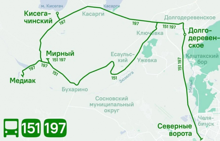 На маршрут № 197 «деревня Медиак — Челябинск (Северные ворота)» поставят один автобус малого класса, который будет ходить каждый день. Первый рейс из Медиака запланирован на 06:15, из Мирного — на 06:30, от Северных ворот — на 08:30. Последний рейс из Медиака будет отправляться в 18:40, из Мирного — в 18:50, от Северных ворот — в 17:25.