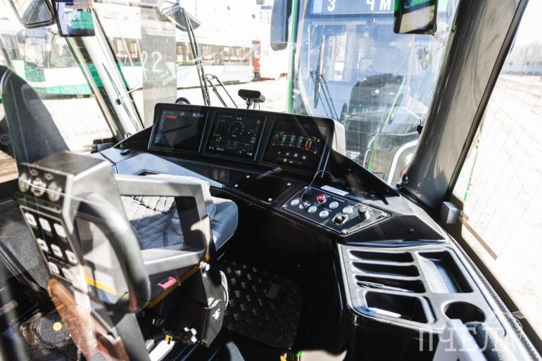 Например, в кабине можно увидеть комфортное сиденье, отсутствие на мониторах кнопок — они есть только для аварийного управления. Трамвай работает в режиме искусственного интеллекта, анализируя свои неисправности и отправляя данные об этом в центр ремонта «ЧелябГЭТа».