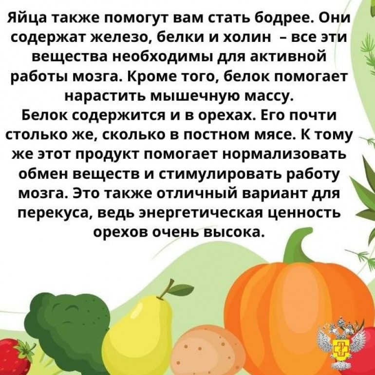 Для активной работы мозга стоит включить яйца, в которых есть железо, белки и холин. А орехи помогут нормализовать обмен веществ.