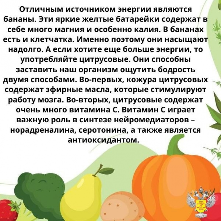 В качестве источника энергии подойдут бананы, богатые магнием, калием, клетчаткой. Помочь ощутить бодрость также могут мандарины и апельсины. В цитрусах много витамина С, который играет важную роль в синтезе нейромедиаторов — норадреналина, серотонина, а также является антиоксидантом.