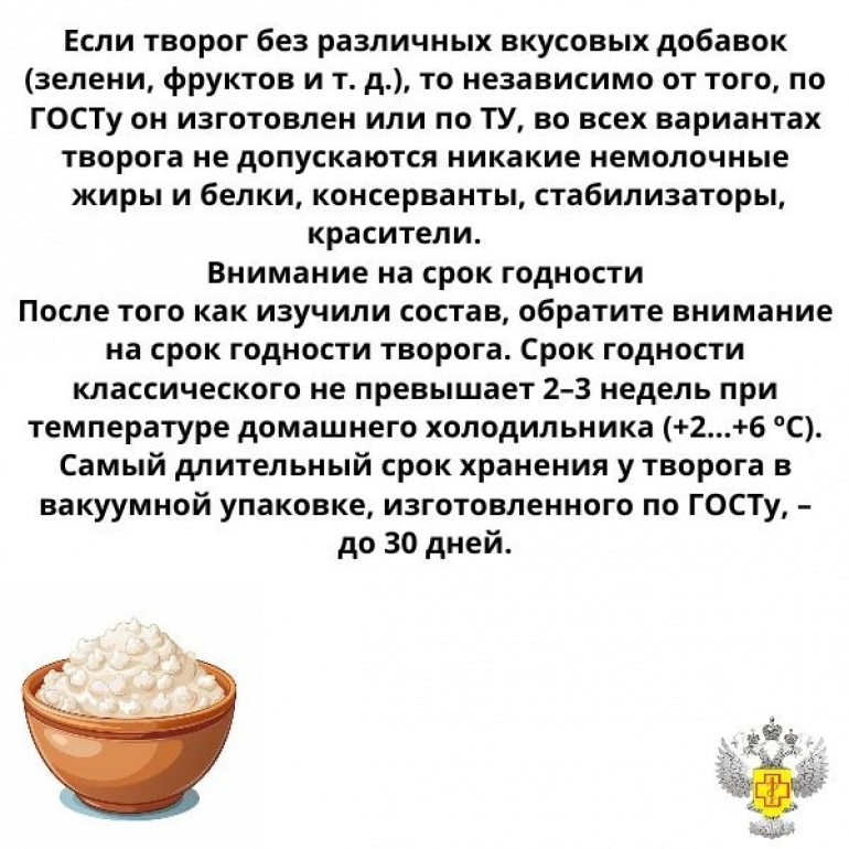 При покупке творога, важно учитывать и срок годности. Он не превышает 2–3 недель при температуре домашнего холодильника.