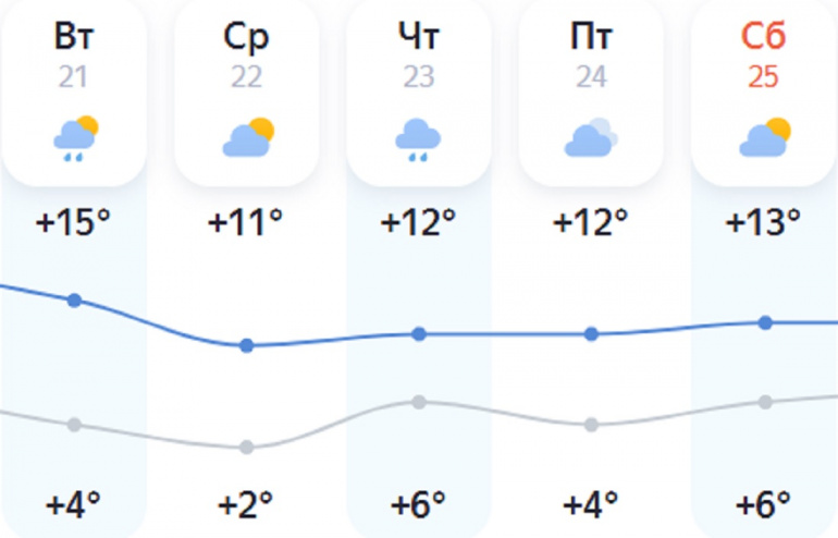 «Яндекс. Погода» сообщает, что со вторника в региональном центре ожидается небольшое похолодание, пройдут небольшие дожди. Днём на протяжении недели будет около +12, а более приятные +17 вернутся только к началу следующей недели. Минусовых температур по ночам пока не прогнозируется.