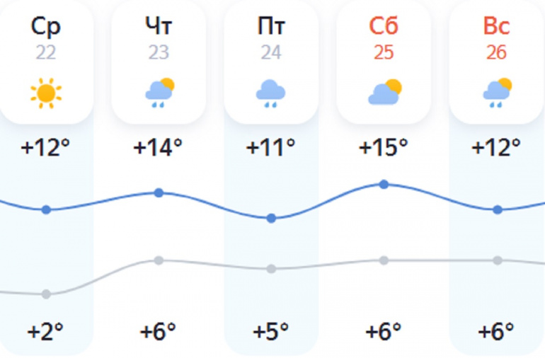 Во вторник в регионе будет облачно, пройдут кратковременные дожди. Ветер южной четверти будет дуть со скоростью 5–10 м/с, местами порывы будут достигать 15 м/с. После ночной температуры около ноля днём потеплеет до +11…+16 °С, на юге до +19 С°, на крайнем севере до +8 °С.