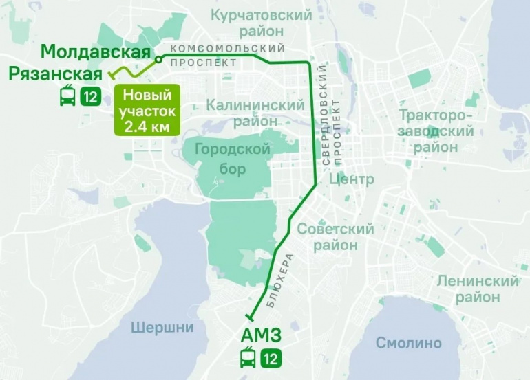 Новый участок протяжённостью 2,4 км пройдёт от улицы Молдавской по Комсомольскому проспекту, Чичерина и Салавата Юлаева. Актуальное расписание уже доступно на сайте gortrans74.ru.