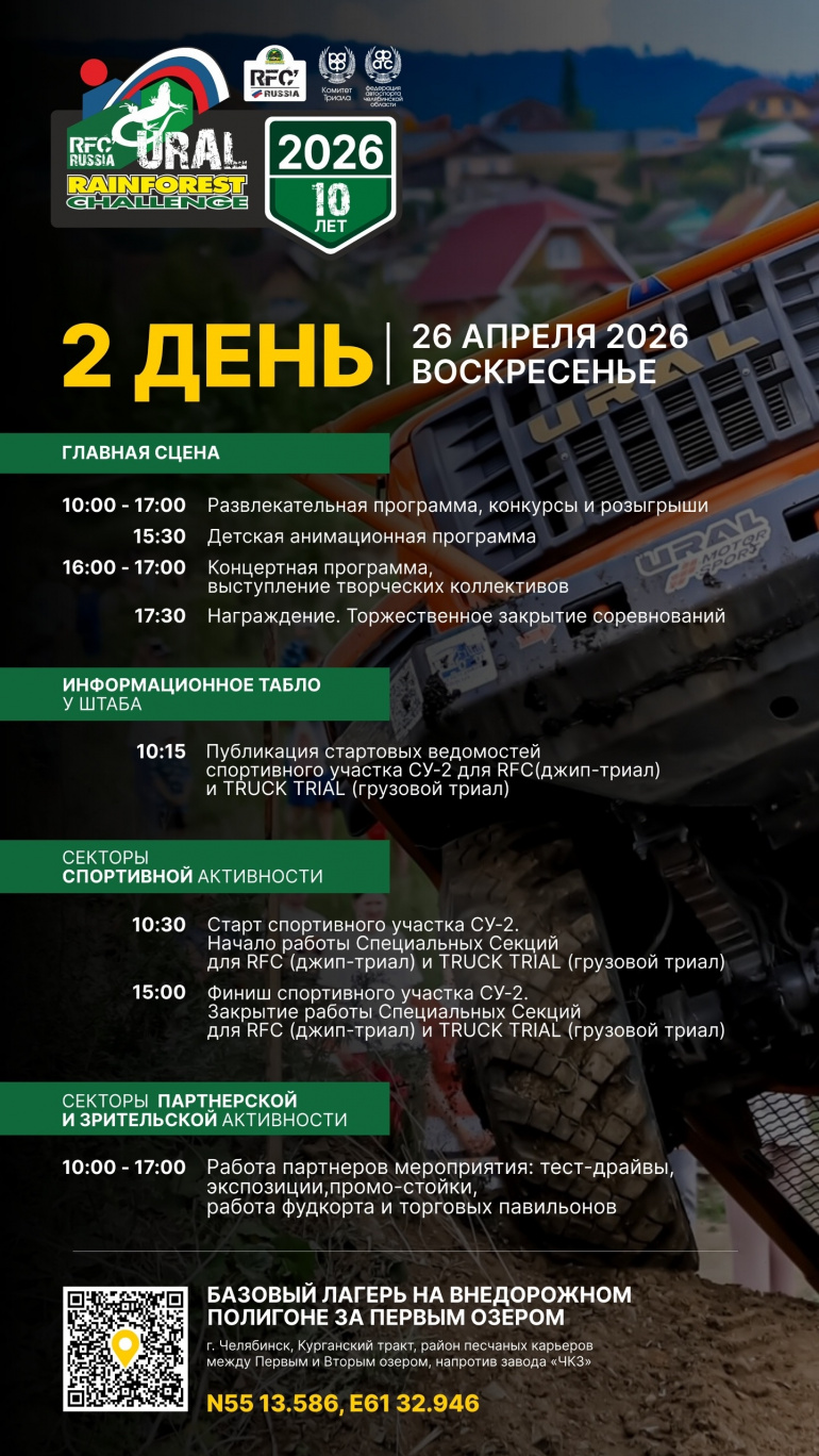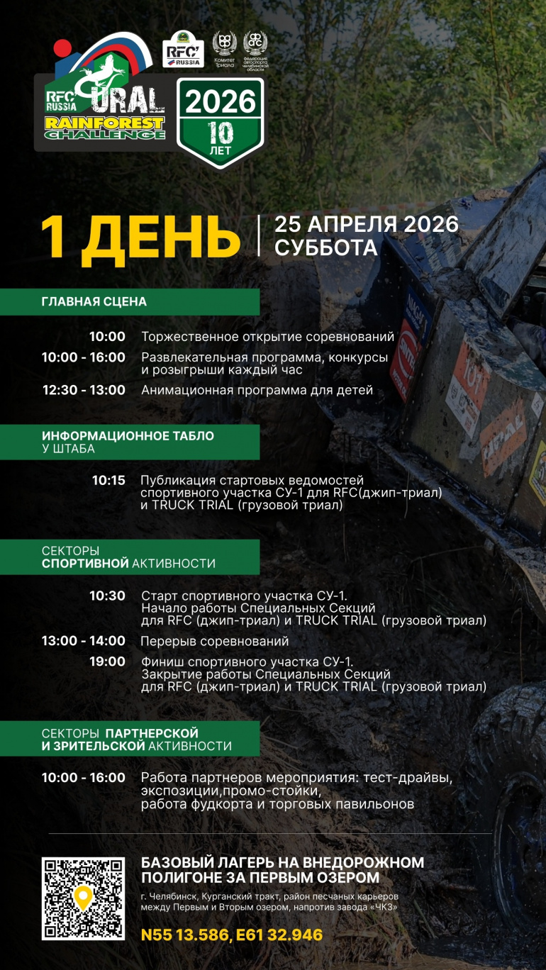 В эти выходные, 25 и 26 апреля, любителей экстрима и автоспорта из Челябинска ждёт одно из самых долгожданных событий весны — соревнования на джипах и грузовиках в условиях жёсткого бездорожья. Ниже публикуем программу на оба дня состязаний.