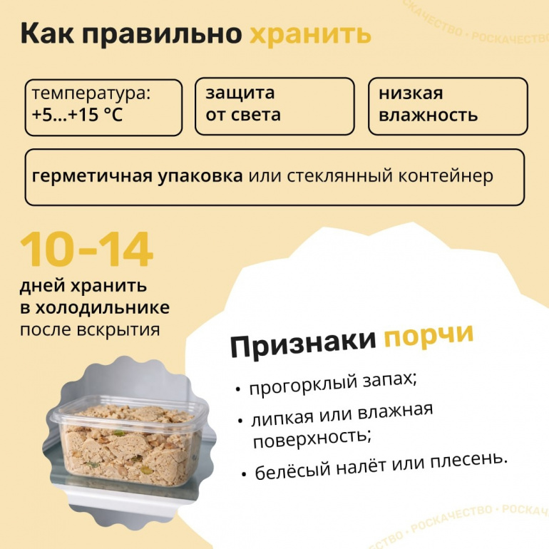 Халву нужно хранить при температуре +5…+15 градусов в герметичной упаковке или стеклянном контейнере.