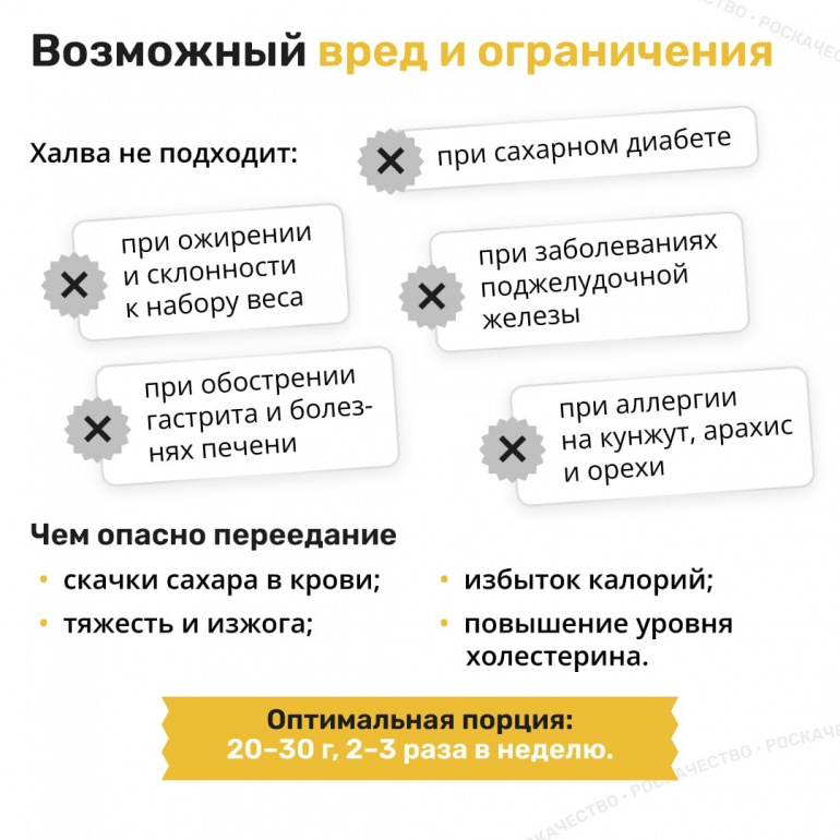 Халва не подходит людям с сахарным диабетом, ожирением, заболеваниями поджелудочной железы, болезнями печени, обострением гастрита и аллергией на арахис, орехи и кунжут. Восточная сладость опасна тем, что вызывает скачки сахара в крови, тяжесть, изжогу и повышает уровень холестерина.