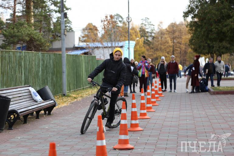 Рядом с главной сценой расположилась одна из площадок — «транспорт». За ограниченное количество времени нужно было проехать между конусов на экологически чистом транспорте — самокате или велосипеде.