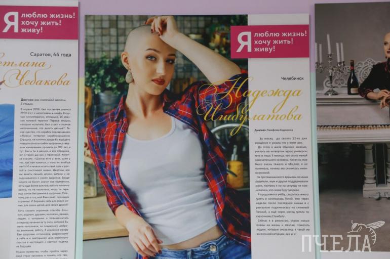 Организатор выставки — челябинка Надежда Ишбулатова. Её фото также размещено здесь — у девушки есть своя история борьбы с раком. В 22 года она узнала, что больна — обнаружили лимфому почки второй стадии. Пришлось пройти через многое: была и химиотерапия, и лучевая терапия. Сейчас у Надежды ремиссия, и она решила, что должна помогать другим.