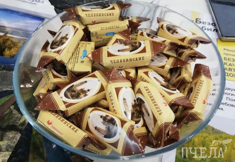 На выставке губернатор угощал министра транспорта РФ Евгения Дитриха и заместителя председателя правительства РФ Максима Акимова челябинскими конфетами.