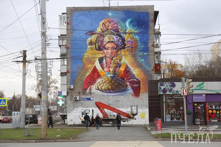 В рамках фестиваля граффити челябинские художники решили нарисовать во всю торцевую стену дома № 161 на улице Труда красивую девушку с японской причёской и караваем. Согласовали граффити с администрацией города и всеми жителями дома, наняли автовышку. Вот только спокойно работать им не дали представили компании, которая раньше размещала на этом месте рекламный баннер.