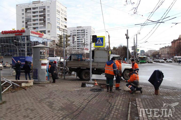 В Челябинске в самом разгаре работы по переносу светофора на перекрёстке проспекта Ленина и улицы Энгельса от торгового комплекса ближе к проспекту. Вновь включить светофоры и стереть ненужную зебру планируют к вечеру среды, 6 ноября.