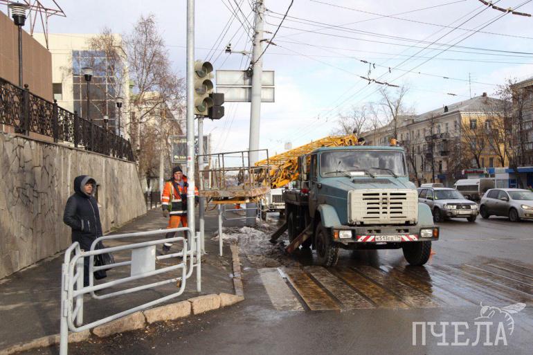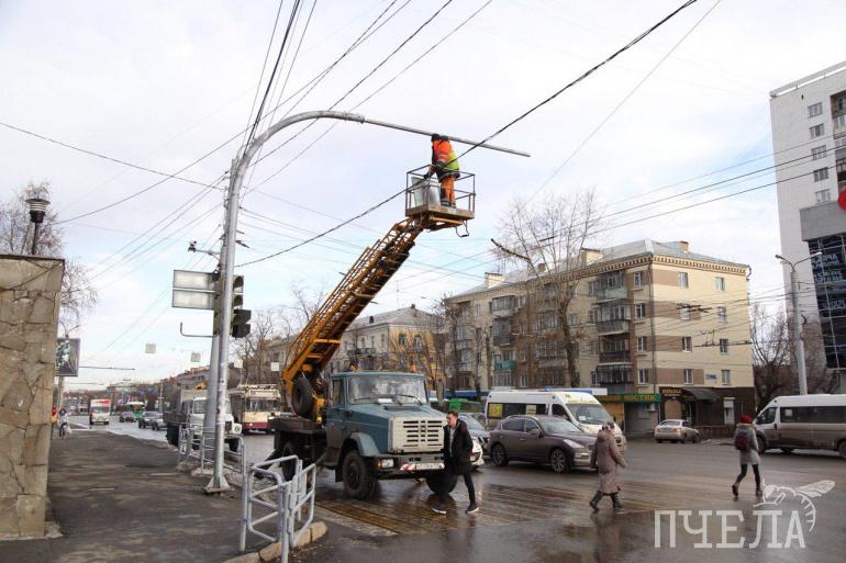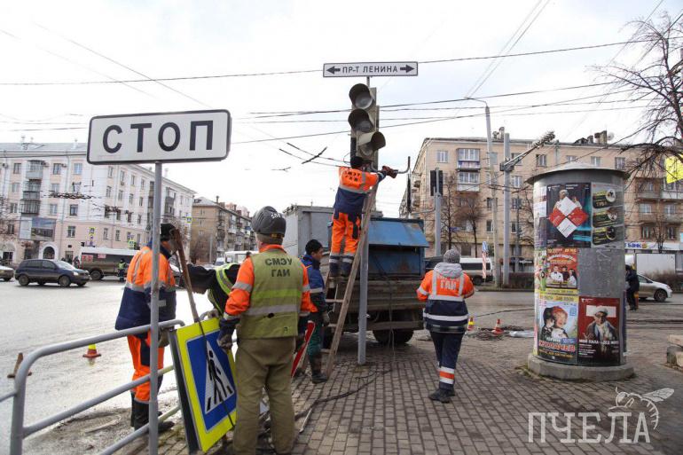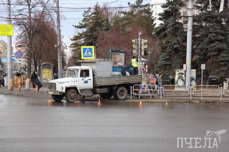 К вечеру на оживлённом проспекте Ленина перенесут светофор. Работы в разгаре