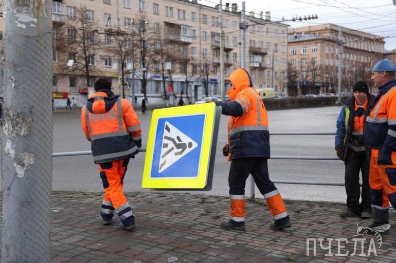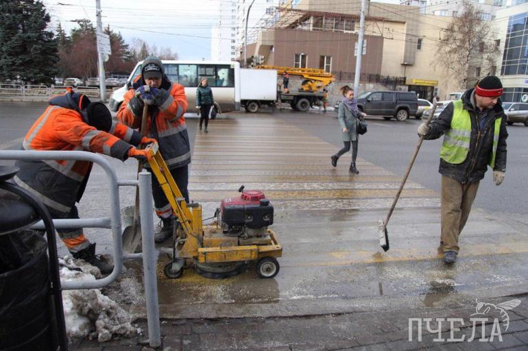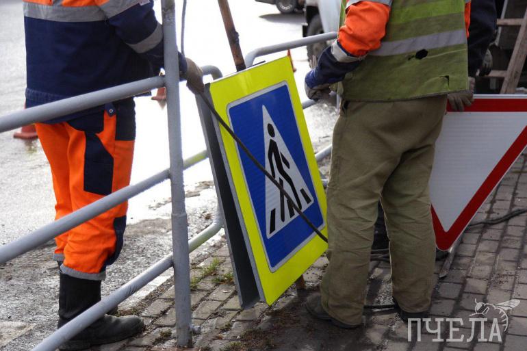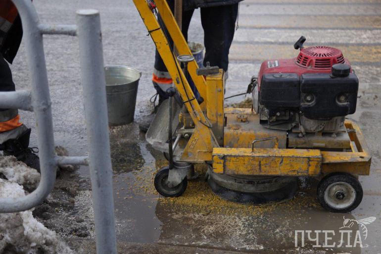 На месте работает сразу 18 человек. Одни настраивают светофор, другие демонтируют ненужное оборудование около упразднённого пешеходного перехода, третьи стирают неактуальную дорожную разметку.