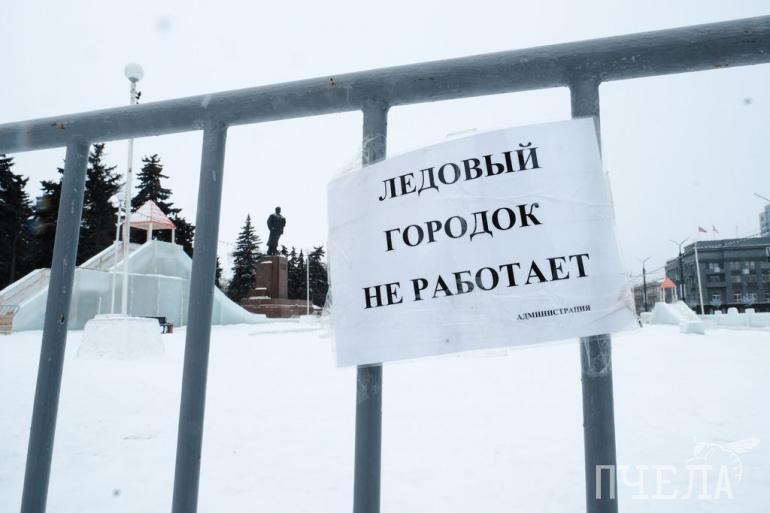 Как пояснила глава города Наталья Котова, городок на площади Революции оградили от посетителей специально, чтобы избежать трагических случаев. Открыли его для посещений только 21 января. За время потепления площадка лишилась одной из четырёхметровых скульптур — «улетели» гуси-лебеди.