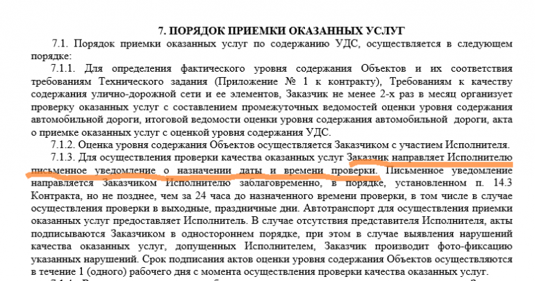 В контракте, опубликованном на сайте госзакупок, указано, что проверка организуется не менее двух раз в месяц, при этом заказчик ещё и направляет исполнителю уведомление о назначении даты и времени этой проверки. Даже транспорт для выезда предоставляет подрядчик.