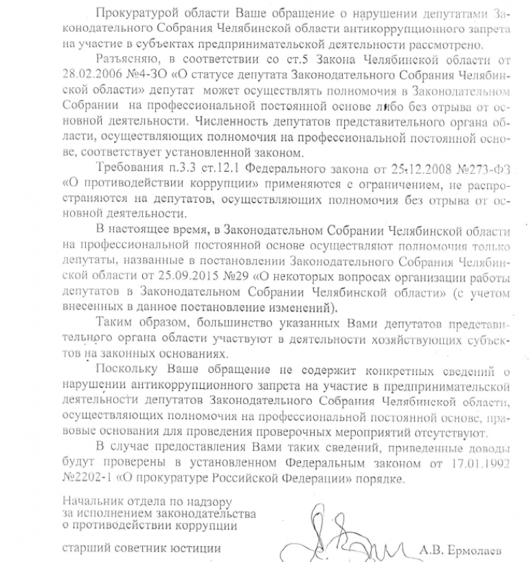 Челябинец получил ответ от начальника отдела по надзору за исполнением законодательства о противодействии коррупции. В нём говорится, что «поскольку обращение не содержит конкретных сведений о нарушении антикоррупционного запрета на участие в предпринимательской деятельности депутатов, осуществляющих полномочия на профессиональной постоянной основе, правовые основания для проведения проверочных мероприятий отсутствуют». Если же эти сведения будут предоставлены, то доводы проверят в установленном законом порядке.