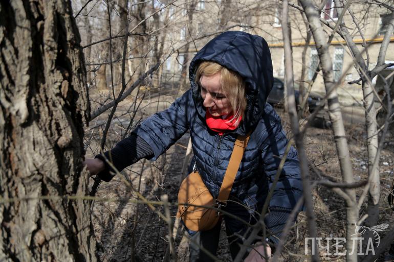 Мы перемещаемся в один из дворов, который выглядит немного апокалиптично: детская качеля на фоне оттаявших мусорных куч, поваленные стволы деревьев, и кажется, эта же судьба ожидает некоторые из тех, что еще стоят. Наталья Генрих подходит к одному из них, нажимает на кору и смотрит внутрь — там грибок.