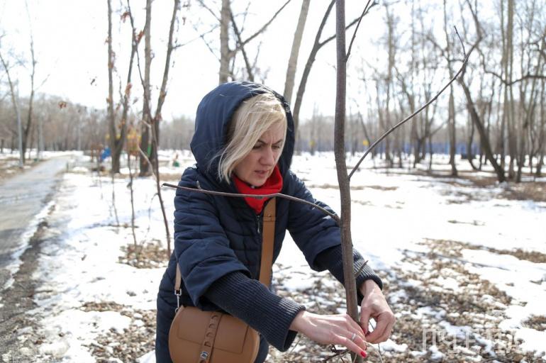 А совсем свежие посадки — это рябина. Наталья убирает перетяжки с молодых деревьев. Весной дерево начнет пить, пойдет в рост, а перетяжка ее давит: те, кто должен следить за сквером, вовремя их не убрали, пора это сделать.