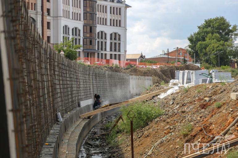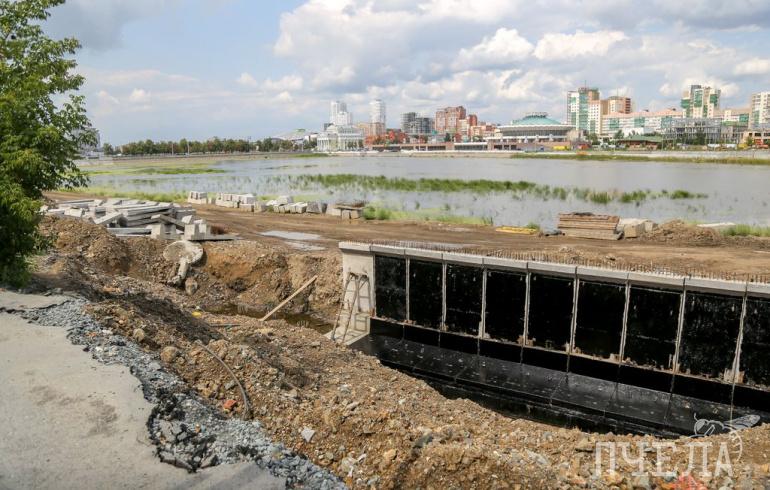 Периодически к набережной подходят любопытствующие горожане. Многих интересуют трубы, из которых в реку льется вода. Повода для беспокойства нет: это та же самая вода из реки. Дело в том, что грунтовые воды подтапливают строительную площадку, поэтому было принято решение возвращать эту воду обратно в реку с помощью насосов.