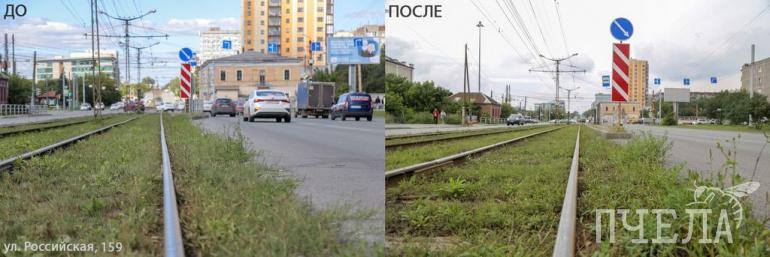 Трава на трамвайных путях на улице Российской продолжает колоситься